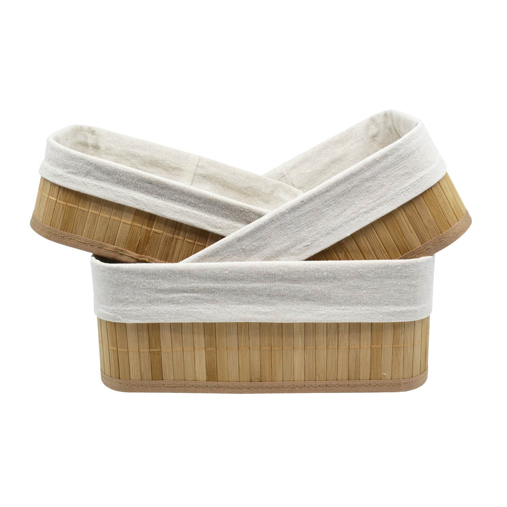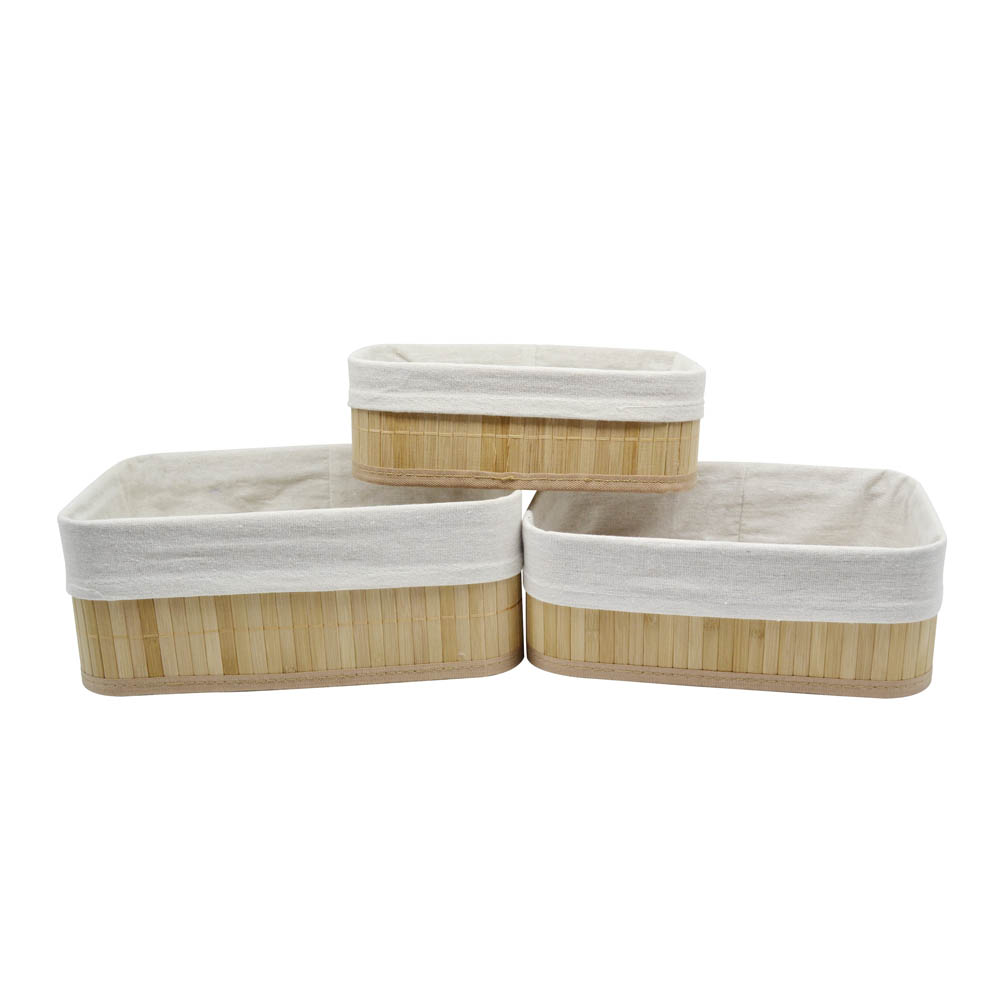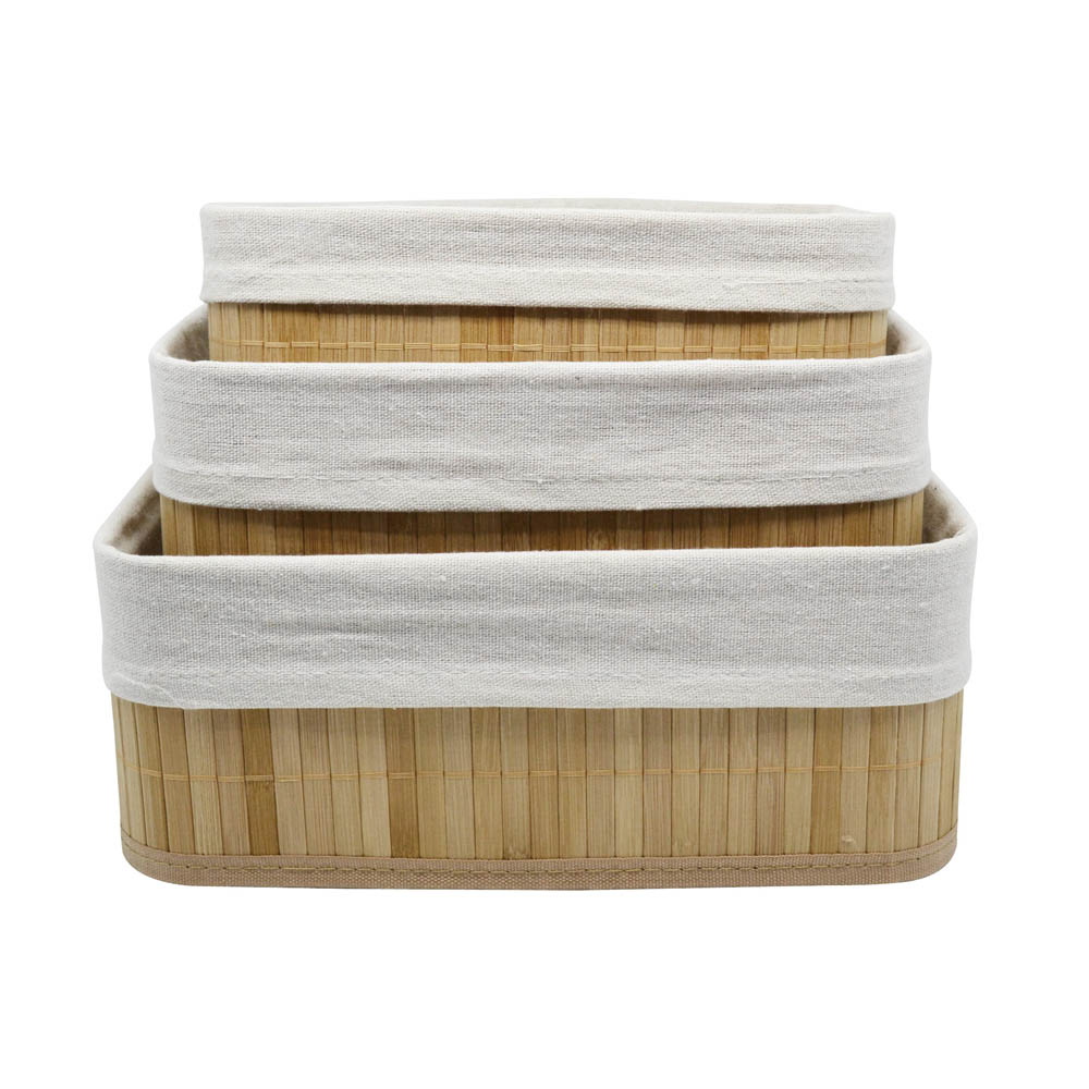 Σετ τριών τεμαχίων καλαθάκια από ξύλο μπαμπού σε φυσικό χρώμα και αφαιρούμενο ύφασμα. H σύνθεση του υφάσματος είναι από βαμβακερό λινό κ πολυεστέρα. Διαστάσεις: 30x20x12εκ., 28x18x10εκ. και 25x15x8εκ.