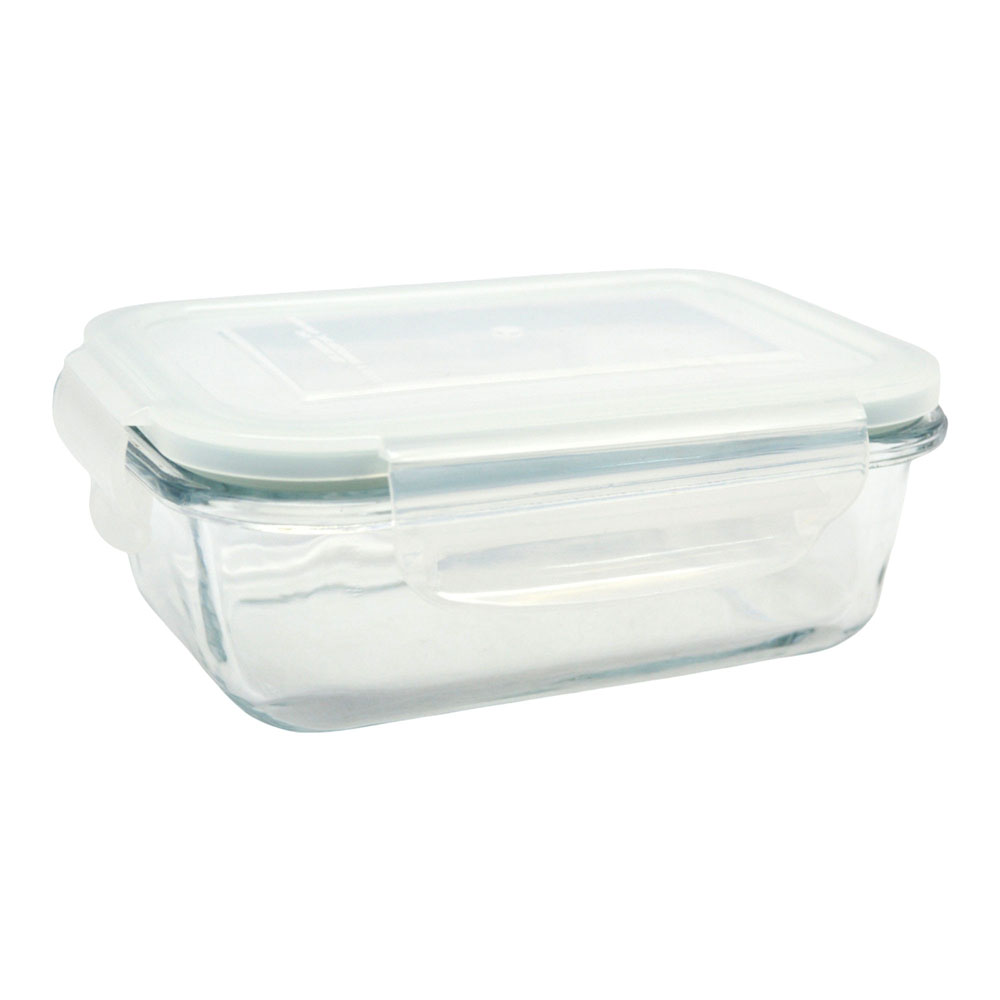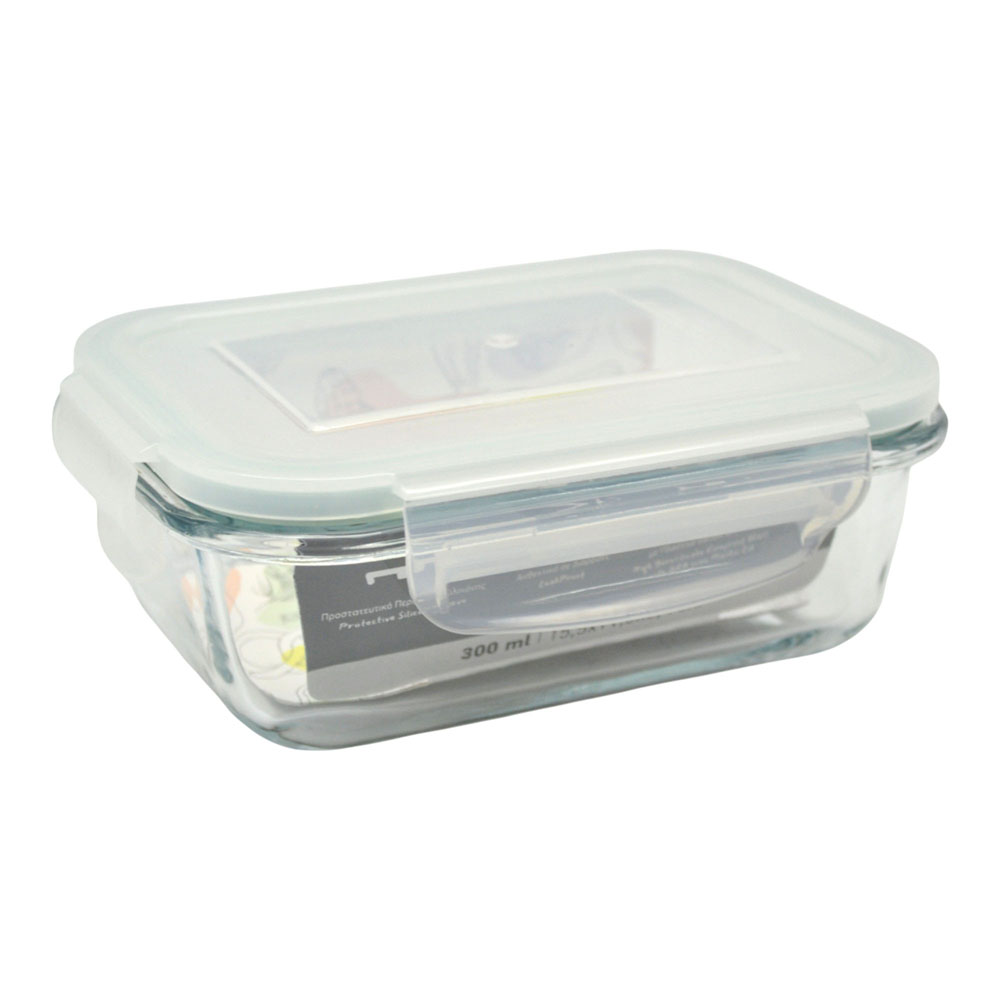 Ορθογώνιο φαγητοδοχείο από βοριοπυριτικό πυράντοχο γυαλί με πλαστικό καπάκι ασφαλείας και προστατευτικό περίβλημα σιλικόνης. Ανθεκτικό σε διαρροές και BPA free, διατηρεί το φαγητό φρέσκο και ασφαλές.