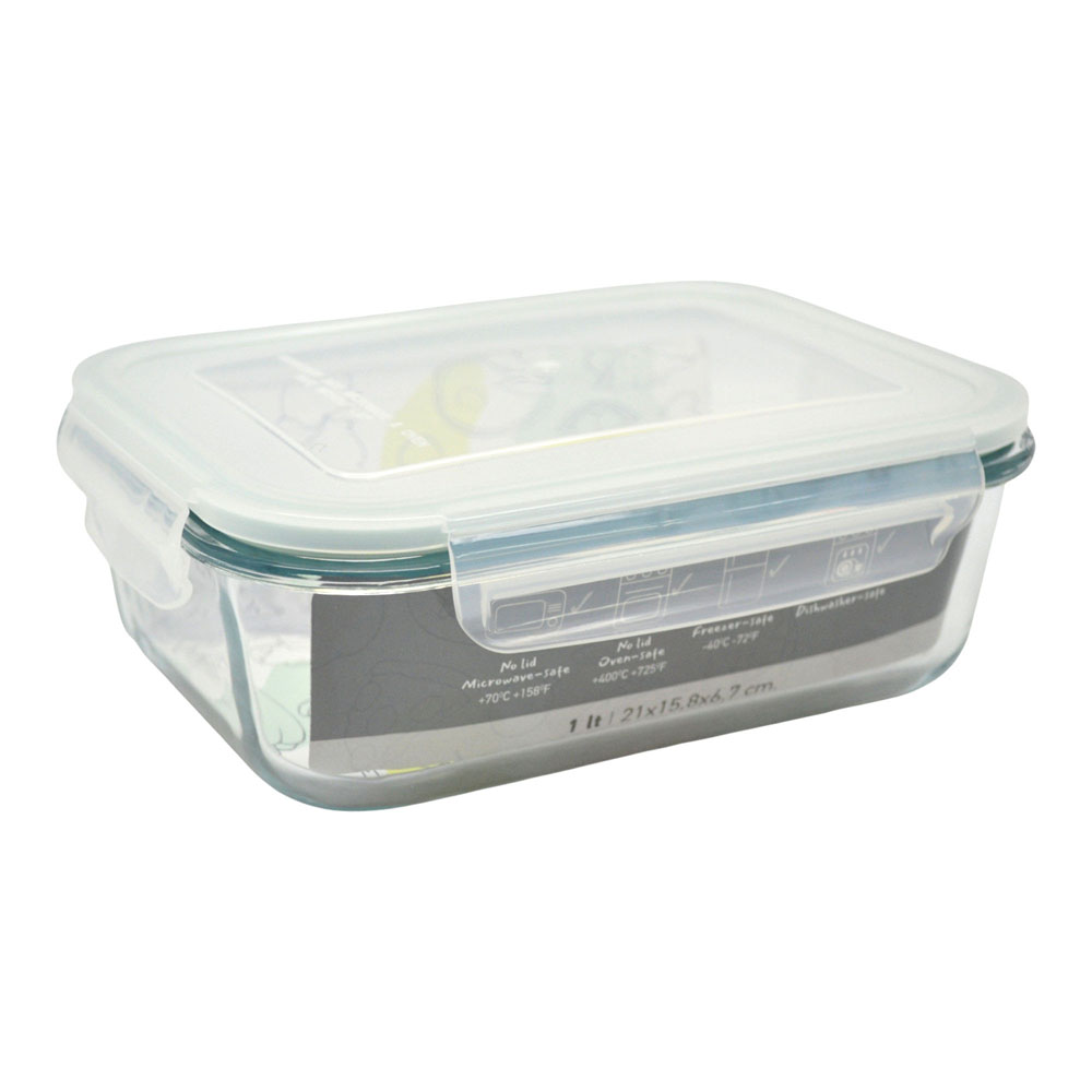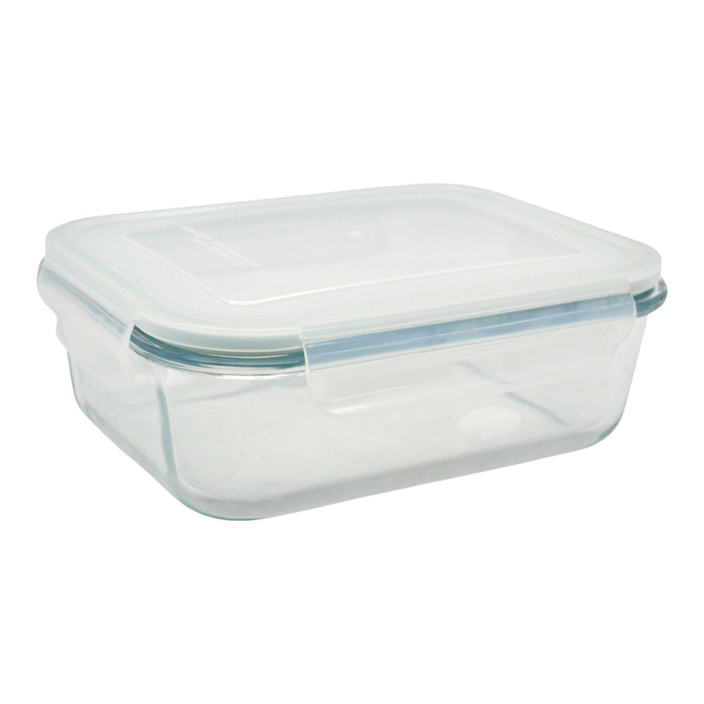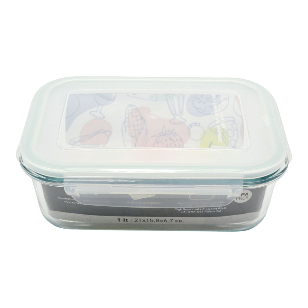 Ορθογώνιο φαγητοδοχείο από βοριοπυριτικό πυράντοχο γυαλί με πλαστικό καπάκι ασφαλείας και προστατευτικό περίβλημα σιλικόνης. Ανθεκτικό σε διαρροές και BPA free, διατηρεί το φαγητό φρέσκο και ασφαλές.