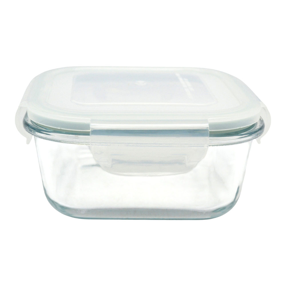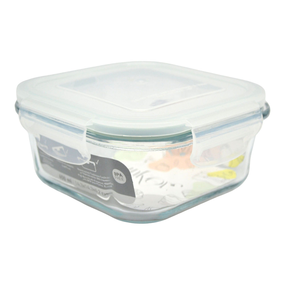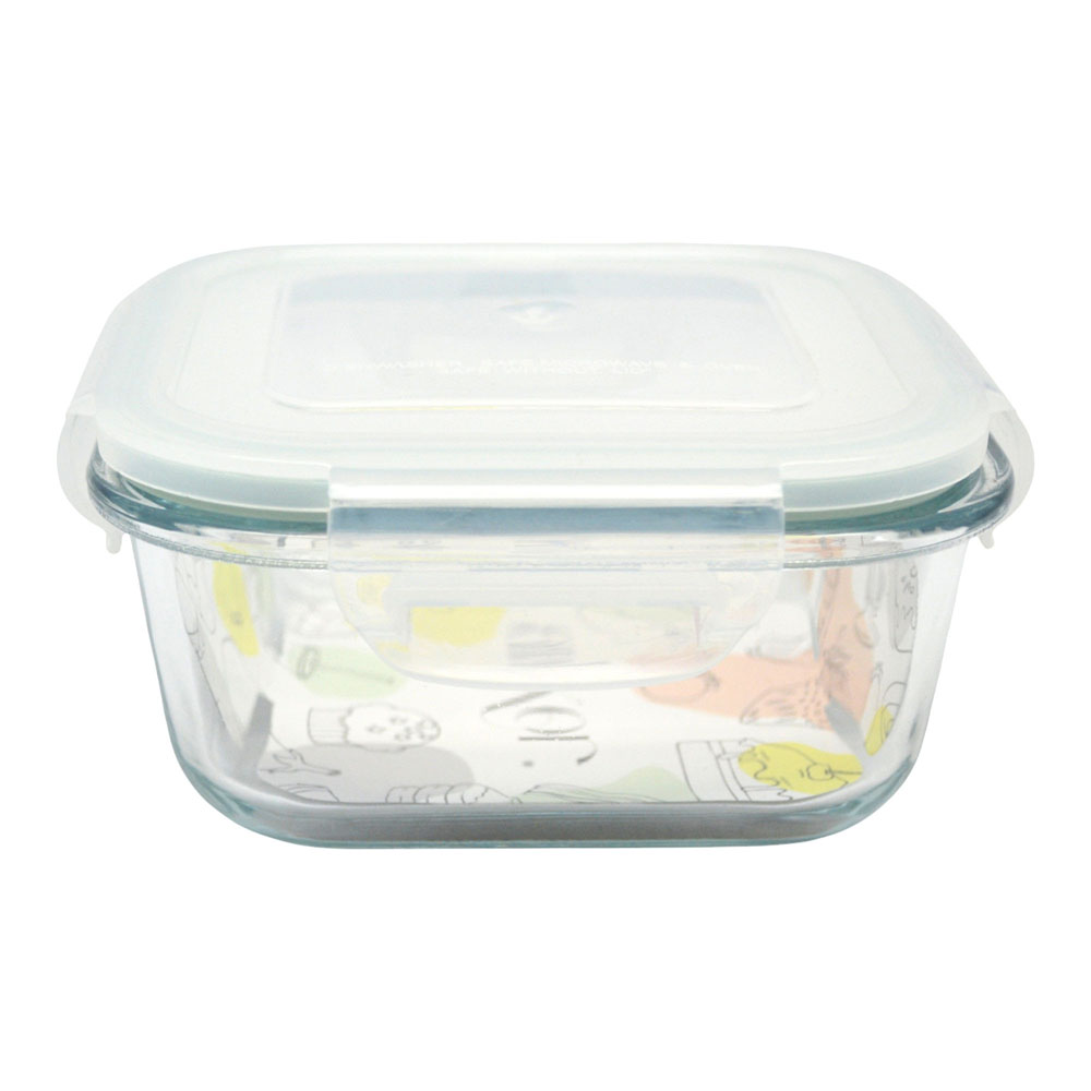 Τετράγωνο φαγητοδοχείο από βοριοπυριτικό πυράντοχο γυαλί με πλαστικό καπάκι ασφαλείας και προστατευτικό περίβλημα σιλικόνης. Ανθεκτικό σε διαρροές και BPA free, διατηρεί το φαγητό φρέσκο και ασφαλές.