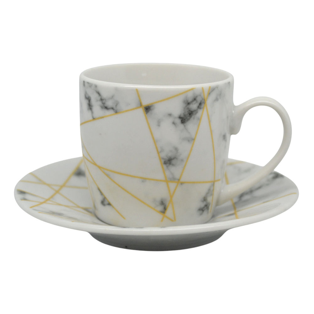 Σετ 6 τεμαχίων φλυτζάνια για καφέ με πιατάκια κατασκευασμένα από πορσελάνη, με σχέδιο εφέ άσπρο μάρμαρο και χρυσές γραμμικές λεπτομέρειες. Σερβίρετε και απολαύστε τον αγαπημένο σας καφέ. Κατάλληλα για χρήση στο πλυντήριο πιάτων.