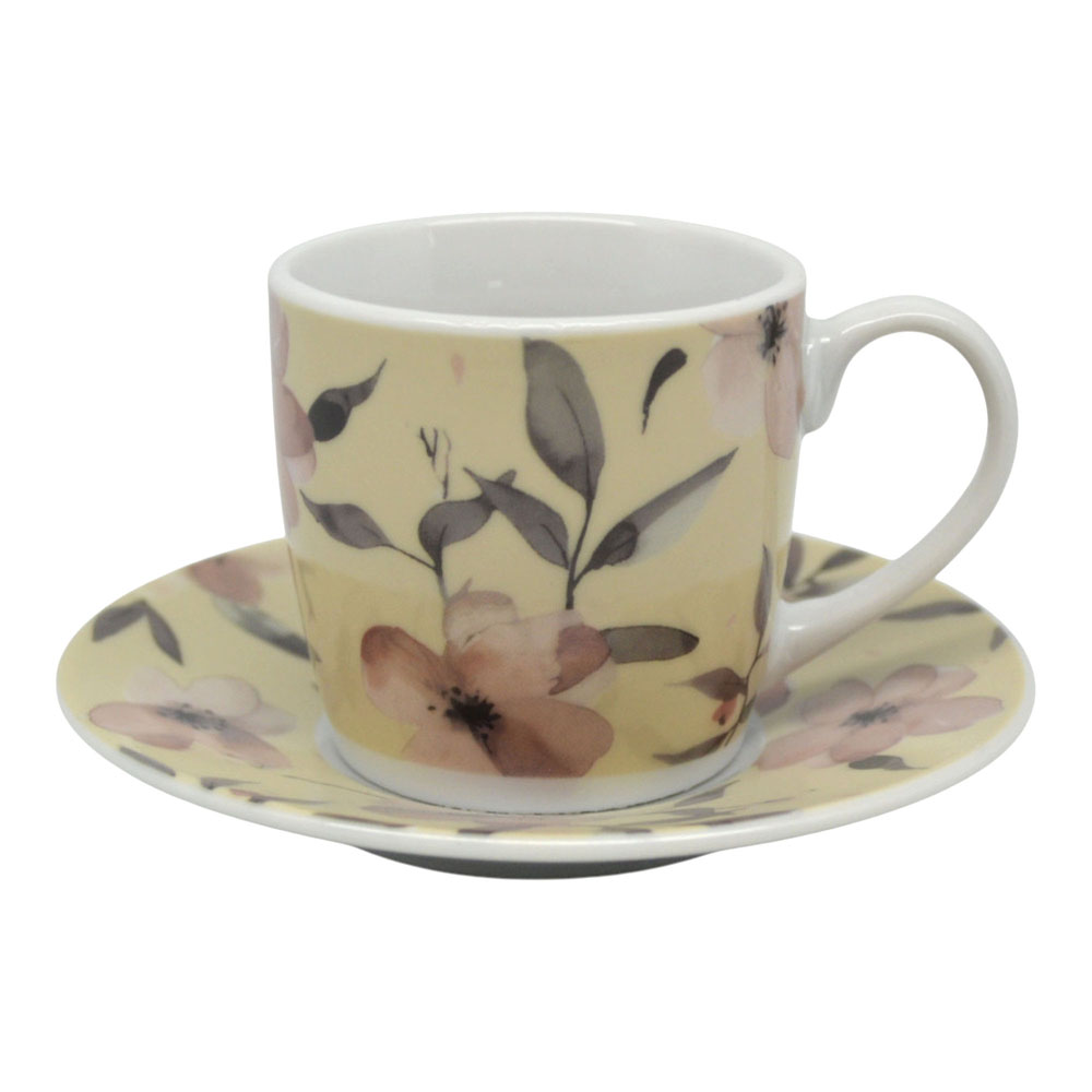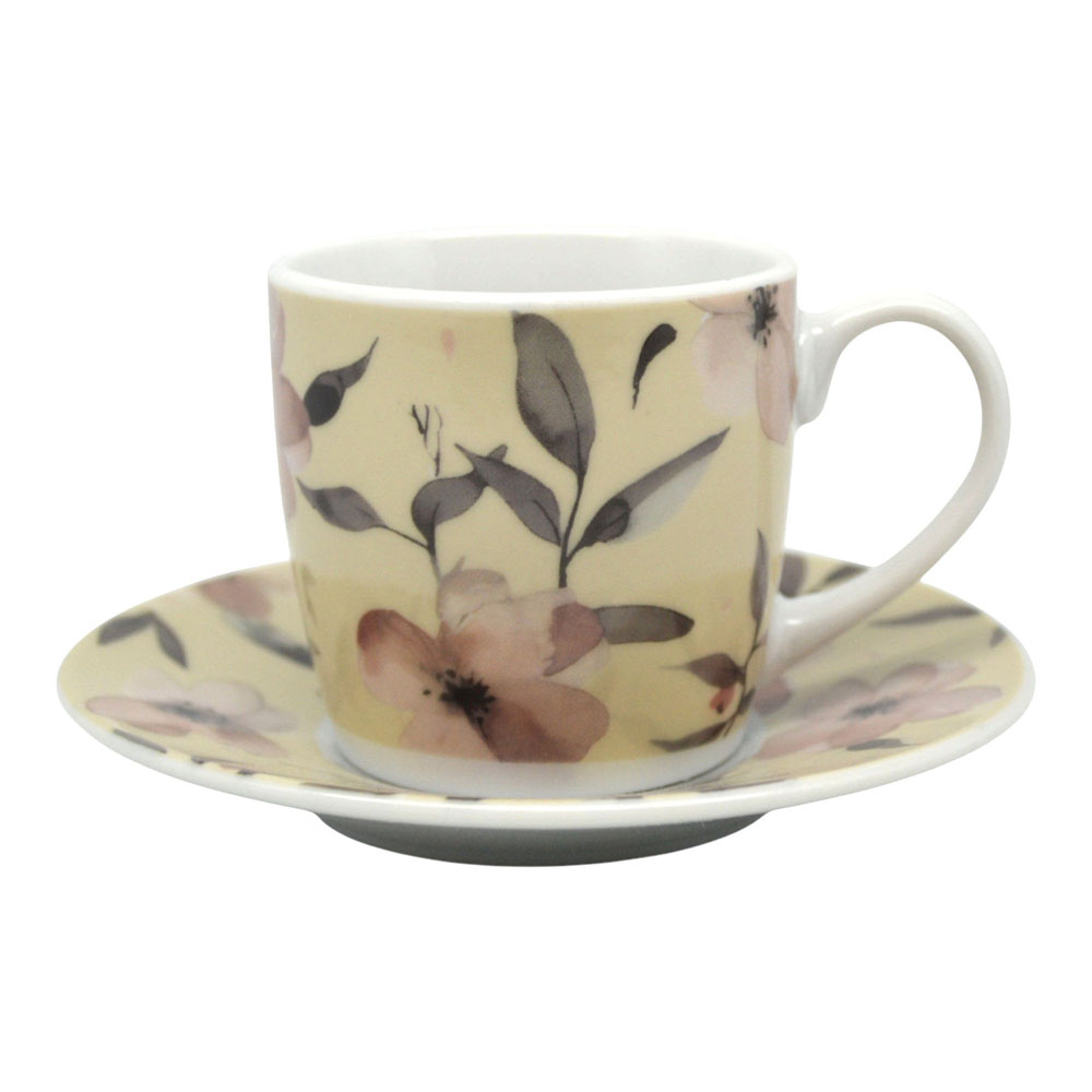 Σετ 6 τεμαχίων φλυτζάνια για καφέ με πιατάκια, κατασκευασμένα από πορσελάνη, με κομψό φλοράλ σχέδιο σε απαλές αποχρώσεις και σε συσκευασία δώρου. Σερβίρετε και απολαύστε τον αγαπημένο σας καφέ. Κατάλληλα για χρήση στο πλυντήριο πιάτων.