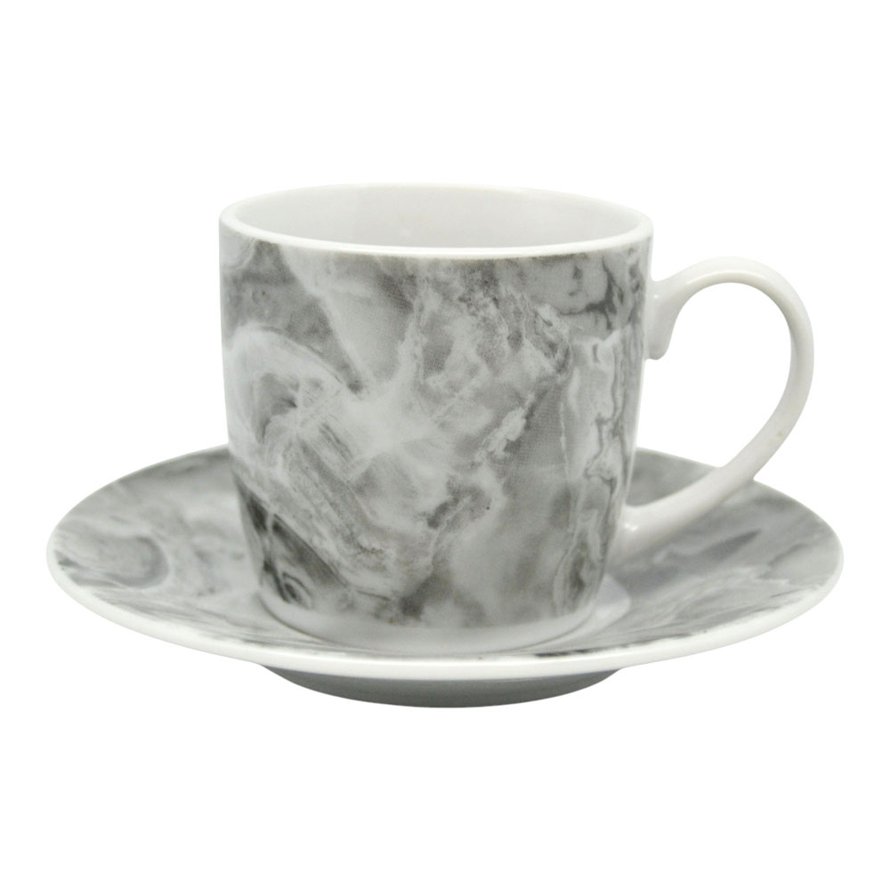 Σετ 6 τεμαχίων φλυτζάνια για καφέ με πιατάκια κατασκευασμένα από πορσελάνη, με σχέδιο εφέ γκρι μάρμαρο και σε συσκευασία δώρου. Σερβίρετε και απολαύστε τον αγαπημένο σας καφέ. Κατάλληλα για χρήση στο πλυντήριο πιάτων.
