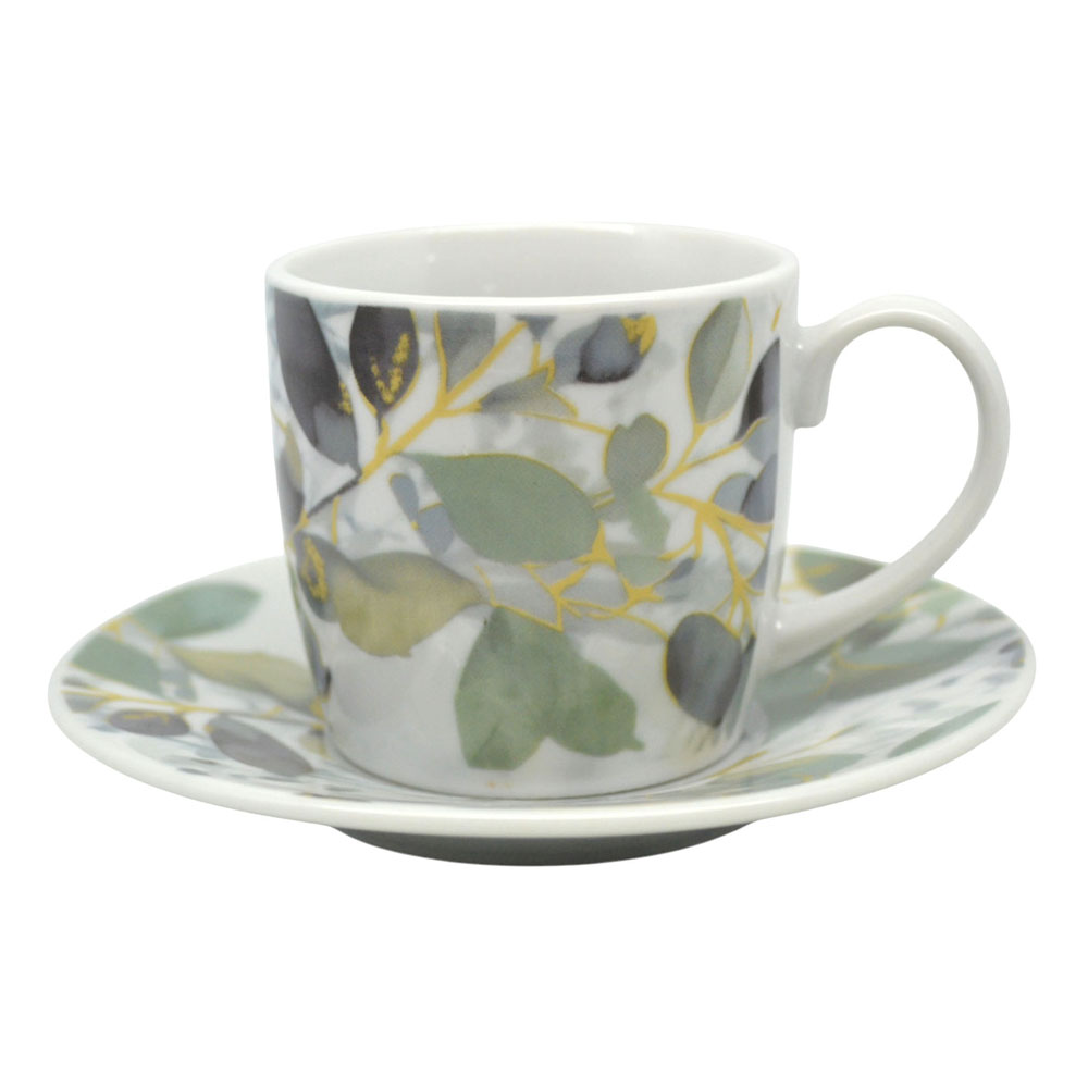 Σετ 6 τεμαχίων φλυτζάνια για καφέ με πιατάκια, κατασκευασμένα από πορσελάνη, με κομψό φυλλωτό σχέδιο σε αποχρώσεις του πράσινου και χρυσές λεπτομέρειες. Σερβίρετε και απολαύστε τον αγαπημένο σας καφέ. Κατάλληλα για χρήση στο πλυντήριο πιάτων.