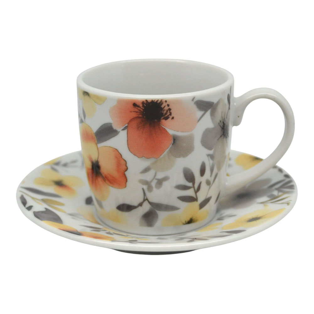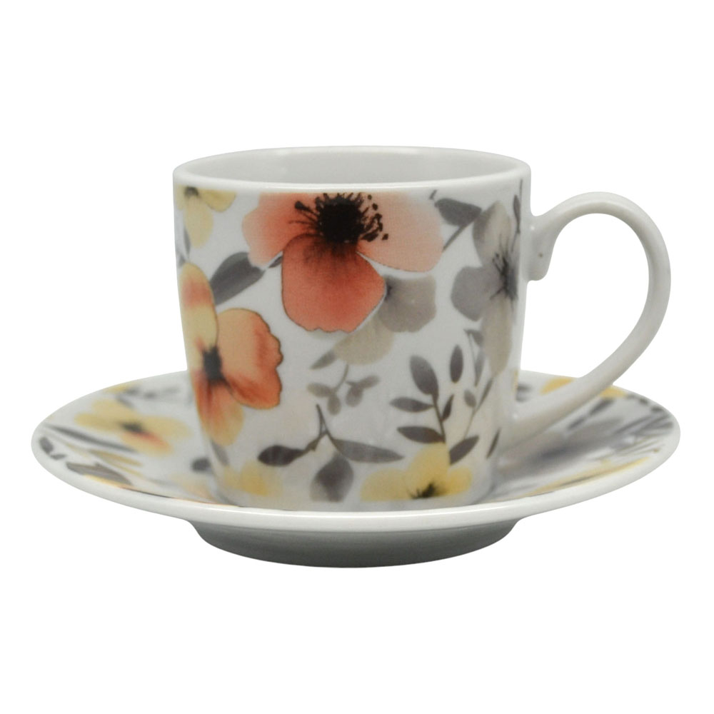 Σετ 6 τεμαχίων φλυτζάνια για καφέ με πιατάκια κατασκευασμένα από πορσελάνη, με σχέδιο λουλούδια σε σομόν και γκρι αποχρώσεις και σε συσκευασία δώρου. Σερβίρετε και απολαύστε τον αγαπημένο σας καφέ. Κατάλληλα για χρήση στο πλυντήριο πιάτων.