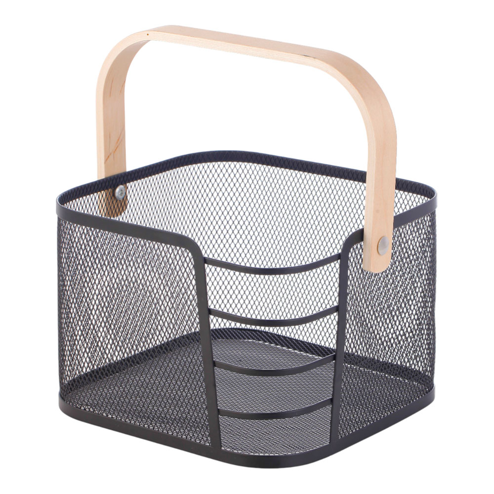 Μεταλλικό καλάθι κουζίνας με ανθεκτική διάτρητη κατασκευή και ξύλινη λαβή για εύκολη μεταφορά. Ιδανικό για αποθήκευση τροφίμων, φρούτων ή αξεσουάρ κουζίνας, συνδυάζει πρακτικότητα με μοντέρνο σχεδιασμό που ταιριάζει σε κάθε πάγκο.