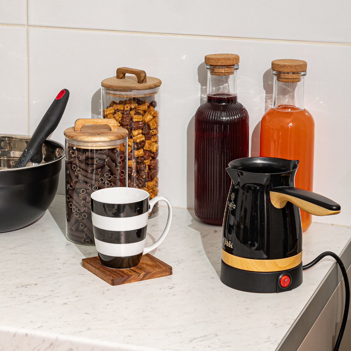 Αναβαθμίστε την καθημερινή ρουτίνα παρασκευής ελληνικού καφέ με το ηλεκτρικό μπρίκι Oak. Με ισχύ 1000W και χωρητικότητα 0.75 λίτρα, αυτό το μπρίκι είναι ιδανικό για γρήγορη και αποτελεσματική παρασκευή του πρωινού καφέ. Διαθέτει αποσπώμενη βάση 360° για απόλυτη ευκολία κατά τη χρήση και αντιθερμικά τοιχώματα. Η εργονομική λαβή εξασφαλίζει άνετο κράτημα και σταθερότητα. Η σειρά ηλεκτρικών συσκευών Oak, περιλαμβάνει μία γκάμα συσκευών για προετοιμασία φαγητού και πρωινού. Αναβαθμίστε την καθημερινότητά σας με στυλ και λειτουργικότητα, ενσωματώνοντας το μοντέρνο σχεδιασμό, με το μαύρο χρώμα και τις λεπτομέρειες ξύλου, στο χώρο σας.