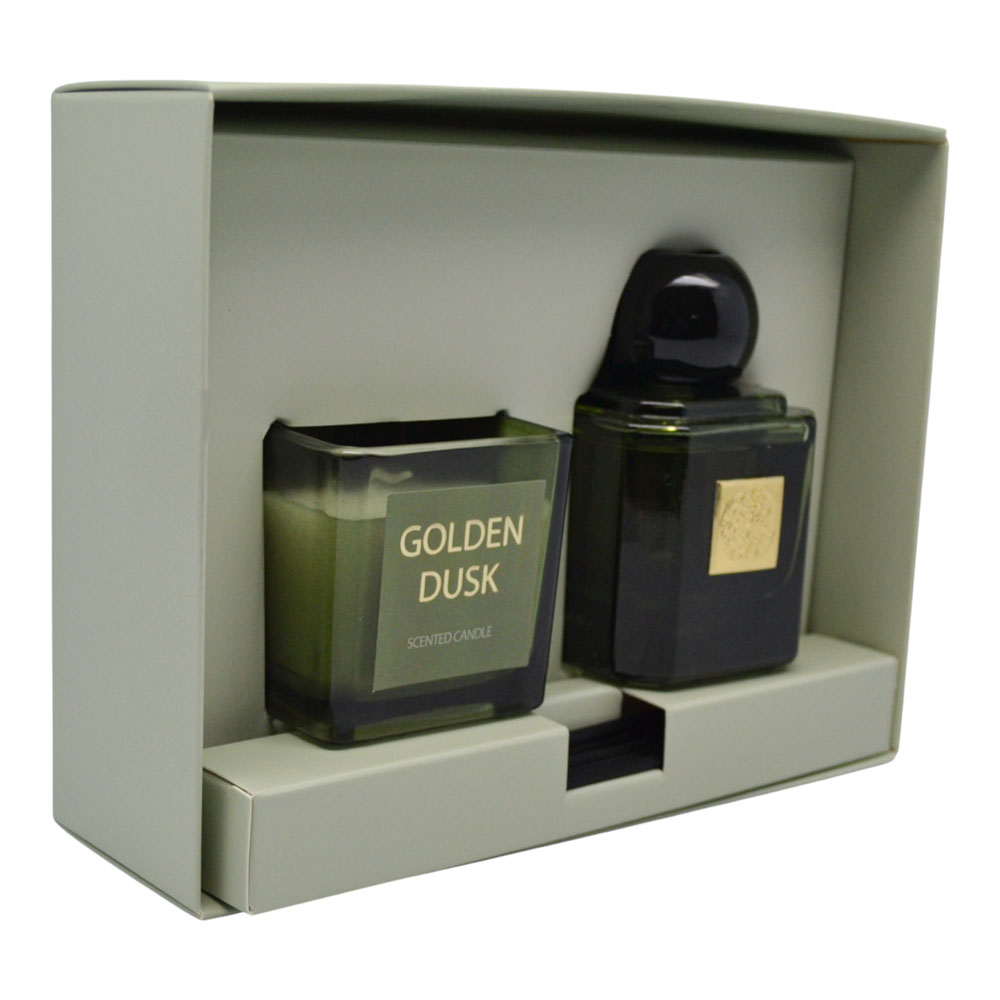 Σετ αρωματικό χώρου με sticks και αρωματικό κερί στο ίδιο ζεστό, κομψό άρωμα. Η πράσινη γυάλινη συσκευασία με χρυσές λεπτομέρειες προσθέτει διακριτή πολυτέλεια, κάνοντας το σετ ιδανικό για δώρο ή για να ανανεώσει την ατμόσφαιρα του σπιτιού.