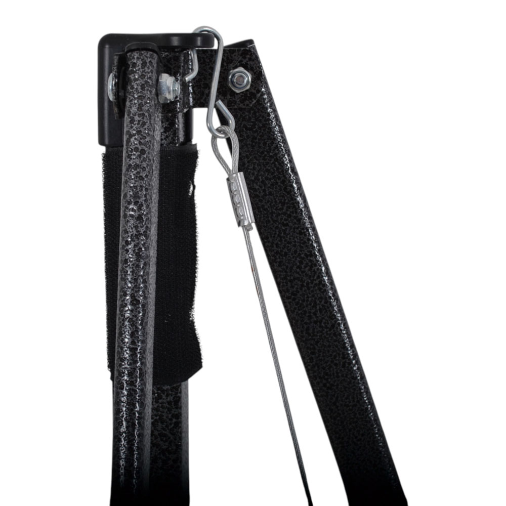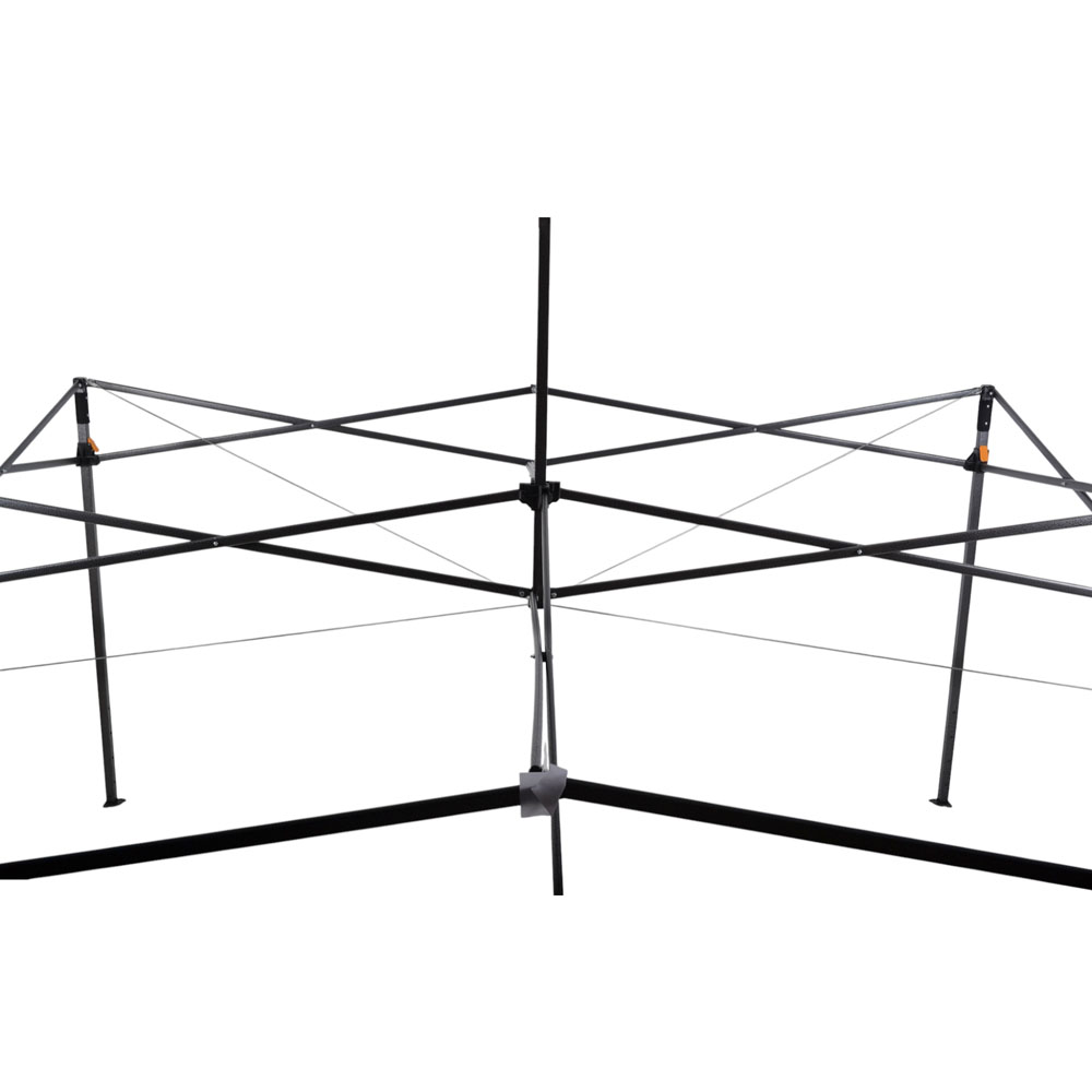 Ενισχυμένο πτυσσόμενο κιόσκι σχεδιασμένο για μεγαλύτερη σταθερότητα στον άνεμο, διαθέτει ανθεκτικό μεταλλικό σκελετό και αδιάβροχο πολυεστερικό ύφασμα 420D για προστασία από τον ήλιο και τις καιρικές συνθήκες. Για επιπλέον αντοχή, διαθέτει 4 συρματόσχοινα από τις γωνίες προς τον κεντρικό πυλώνα, καλυμμένα με PVC, που ενισχύουν τη σταθερότητα της κατασκευής. Το σύστημα στήριξης προσφέρει 3 ρυθμίσεις ύψους (185/193/210εκ.) με κλείδωμα ασφαλείας.