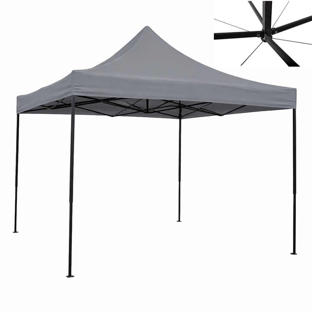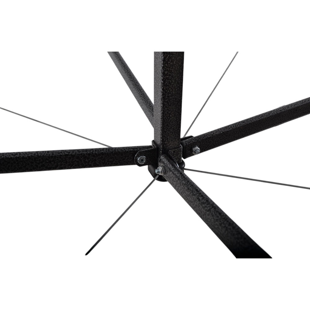 Ενισχυμένο πτυσσόμενο κιόσκι σχεδιασμένο για μεγαλύτερη σταθερότητα στον άνεμο, διαθέτει ανθεκτικό μεταλλικό σκελετό και αδιάβροχο πολυεστερικό ύφασμα 420D για προστασία από τον ήλιο και τις καιρικές συνθήκες. Για επιπλέον αντοχή, διαθέτει 4 συρματόσχοινα από τις γωνίες προς τον κεντρικό πυλώνα, καλυμμένα με PVC, που ενισχύουν τη σταθερότητα της κατασκευής. Το σύστημα στήριξης προσφέρει 3 ρυθμίσεις ύψους (185/193/210εκ.) με κλείδωμα ασφαλείας.