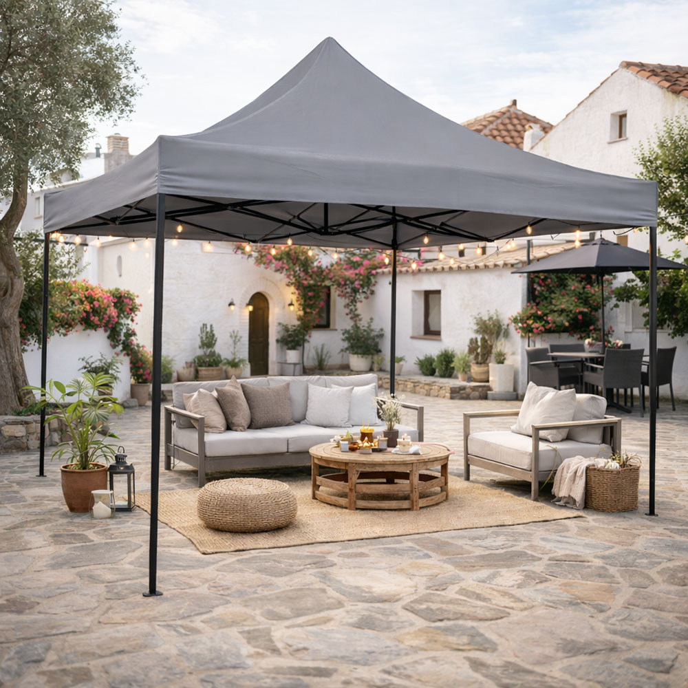 Πτυσσόμενο κιόσκι με μεταλλικό σκελετό και αδιάβροχο πολυεστερικό ύφασμα 800D, ιδανικό για σκίαση σε κήπο, βεράντα ή υπαίθριες δραστηριότητες. Ο ανθεκτικός σκελετός προσφέρει σταθερότητα, ενώ το αδιάβροχο ύφασμα προστατεύει αποτελεσματικά από τον ήλιο και την ελαφριά βροχή. Διαθέτει 3 διαφορετικές επιλογές ρύθμισης ύψους με κλείδωμα ασφαλείας (185/193/210εκ.), ώστε να προσαρμόζεται στις ανάγκες σας. Η συνολική διάσταση του κιόσκι είναι 3x3μ. με μέγιστο ύψος 3,20