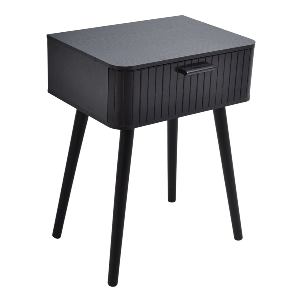 Κομοδίνο με συρτάρι με μοντέρνο σχεδιασμό, σε μαύρη απόχρωση. Διαθέτει επιφάνεια και πλαϊνά με φυσική υφή ξύλου, μπροστινό μέρος με κάθετες γραμμώσεις και εργονομική λαβή. Στηρίζεται σε τέσσερα ξύλινα πόδια που προσφέρουν σταθερότητα και κομψότητα.