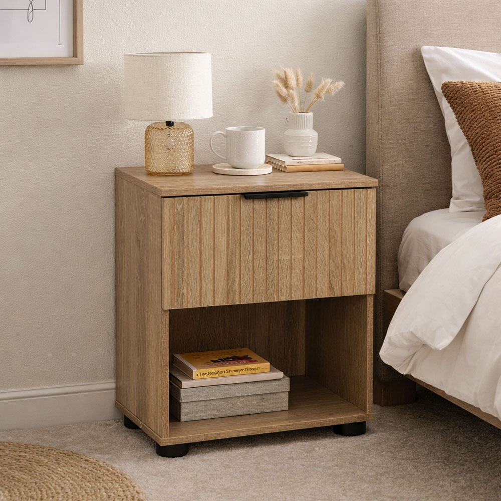 Κομοδίνο από MDF με επένδυση μελαμίνης σε φυσική απόχρωση ξύλου. Διαθέτει συρτάρι για οργανωμένη αποθήκευση και ανοιχτό ράφι για εύκολη πρόσβαση σε καθημερινά αντικείμενα. Η όψη φυσικού ξύλου με διακριτικές κάθετες ανάγλυφες γραμμές προσδίδει μοντέρνο αλλά και διαχρονικό χαρακτήρα, ενώ το μαύρο μεταλλικό πόμολο συμπληρώνει τον σχεδιασμό με κομψή αντίθεση. Η στιβαρή κατασκευή από MDF εξασφαλίζει αντοχή, ενώ η μελαμίνη καθιστά την επιφάνεια εύκολη στο καθάρισμα.