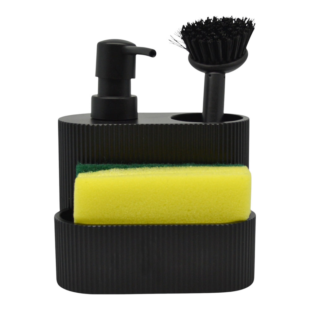 Σαπουνοθήκη για υγρό σαπούνι πολυεστερική σε μαύρο ματ χρώμα, με ανάγλυφη επιφάνεια. Περιλαμβάνει θήκη για σφουγγάρι και βουρτσάκι πιάτων. Ο πρακτικός του σχεδιασμός εξοικονομεί χώρο, διατηρώντας τον πάγκο τακτοποιημένο και κομψό. Στη συσκευασία περιλαμβάνονται το βουρτσάκι και το σφουγγάρι.