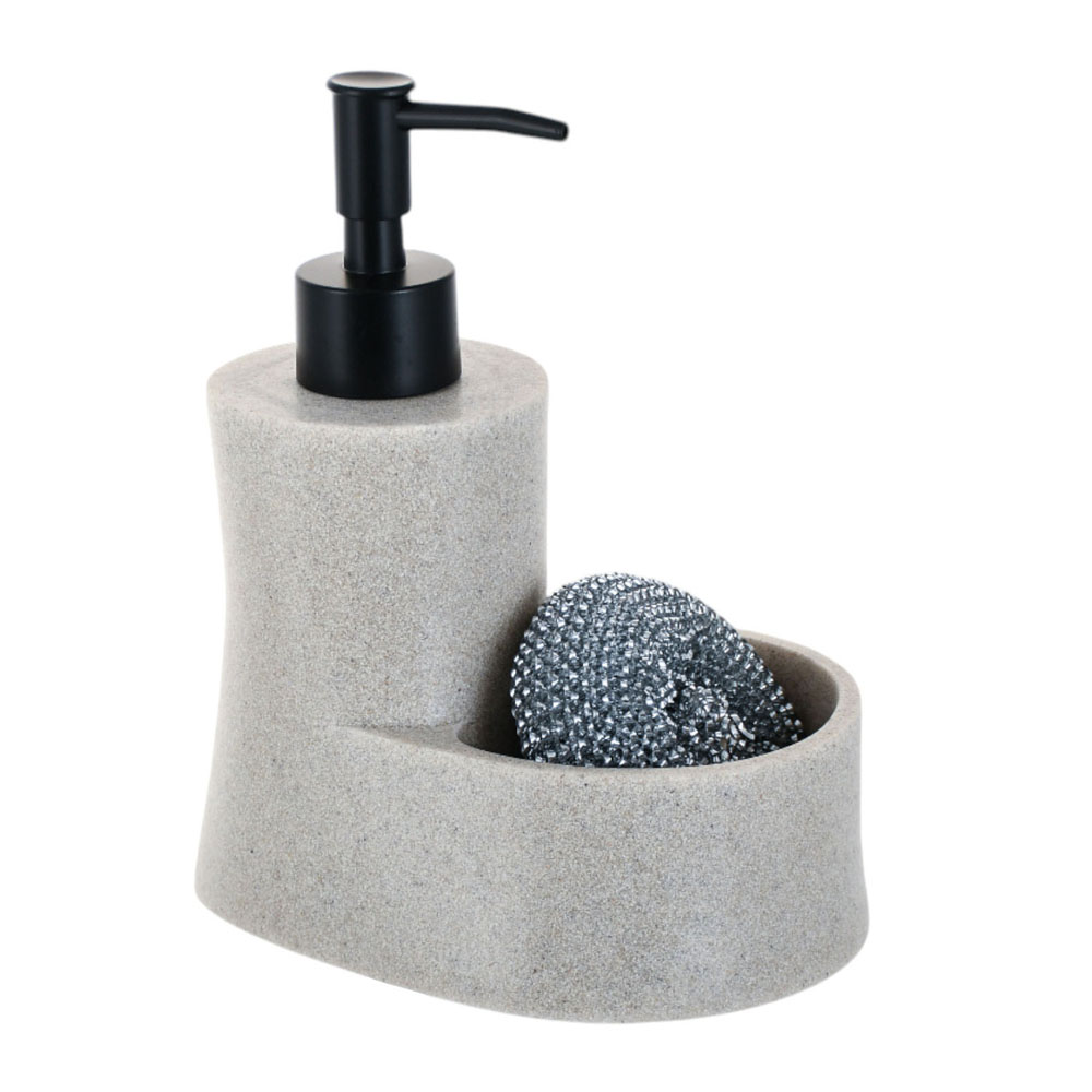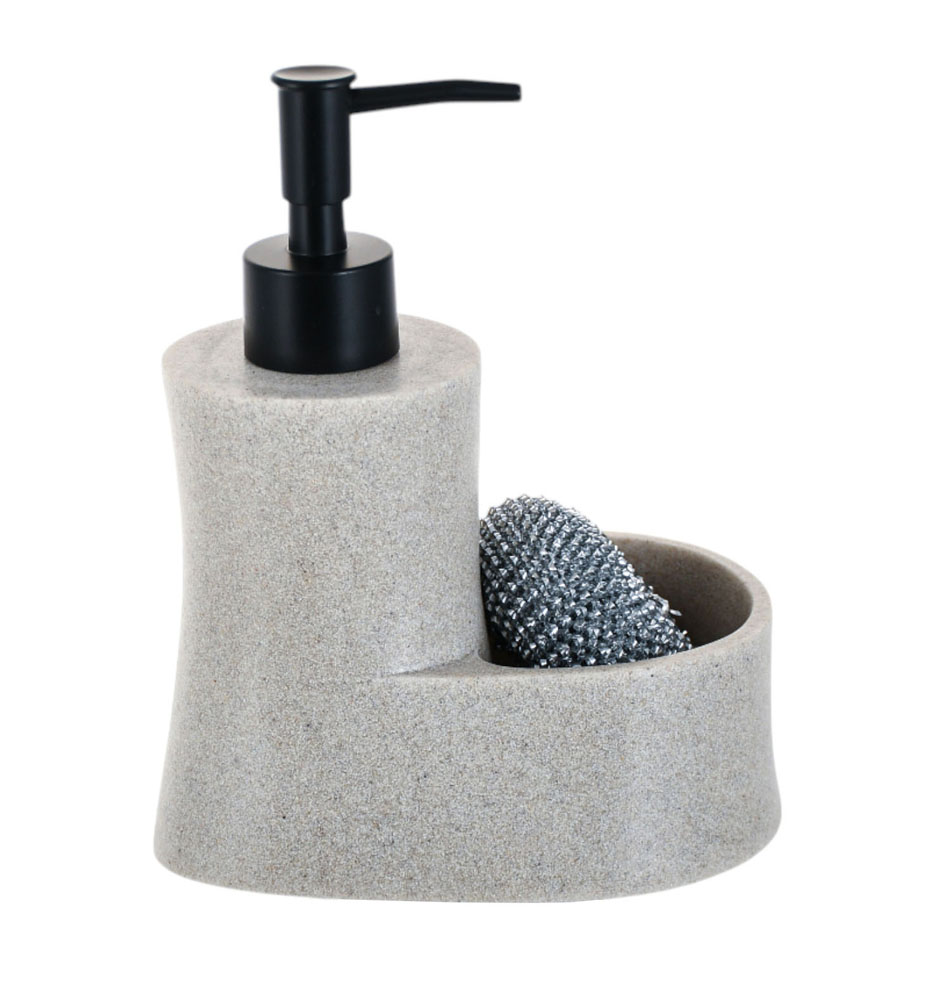 Σαπουνοθήκη για υγρό σαπούνι πολυεστερική, σε μαύρο χρώμα με όψη πέτρας. Διαθέτει πρακτική ενσωματωμένη θήκη για σφουγγάρι ή μικροαντικείμενα, συνδυάζοντας κομψό design και λειτουργικότητα. Στη συσκευασία περιλαμβάνεται σύρμα καθαρισμού.