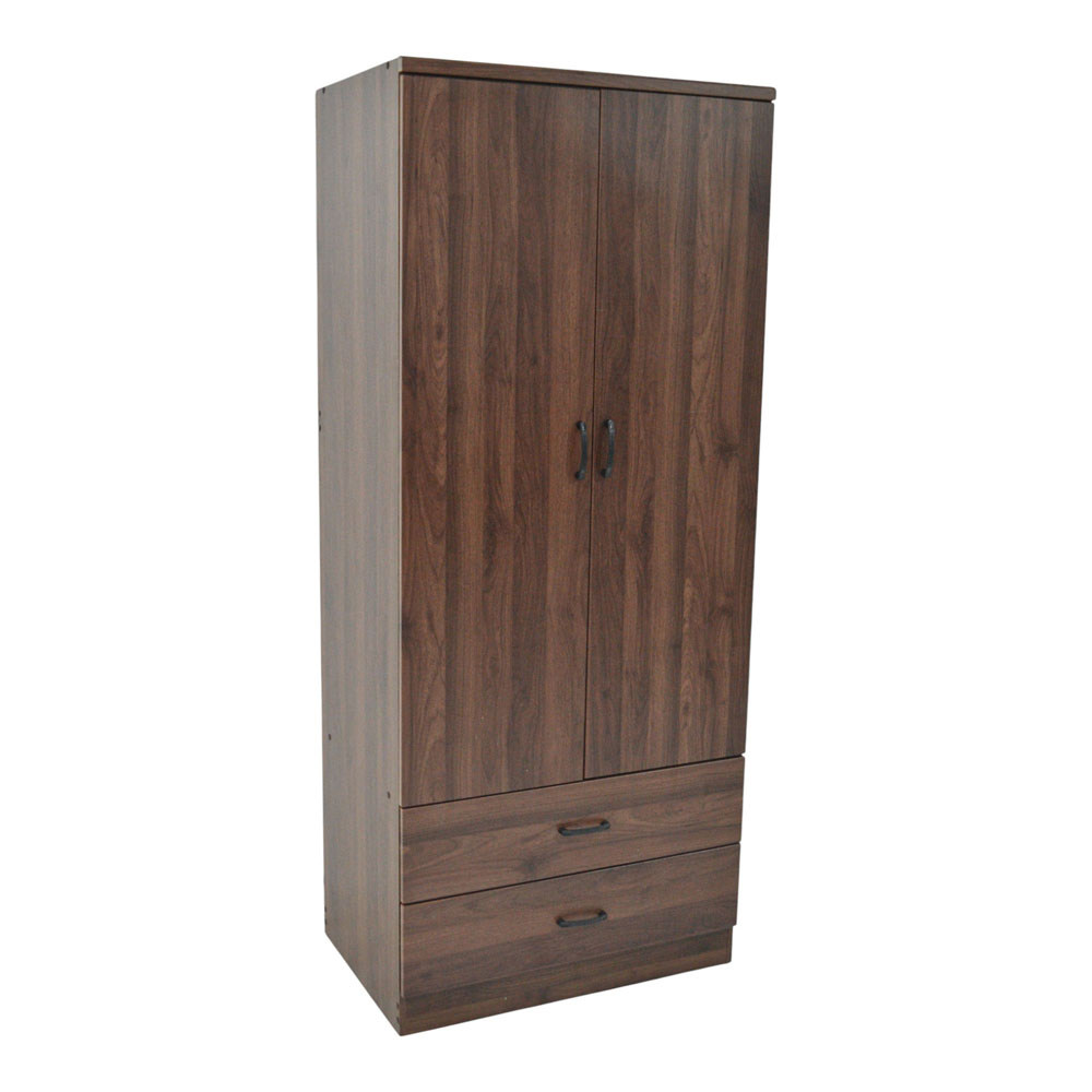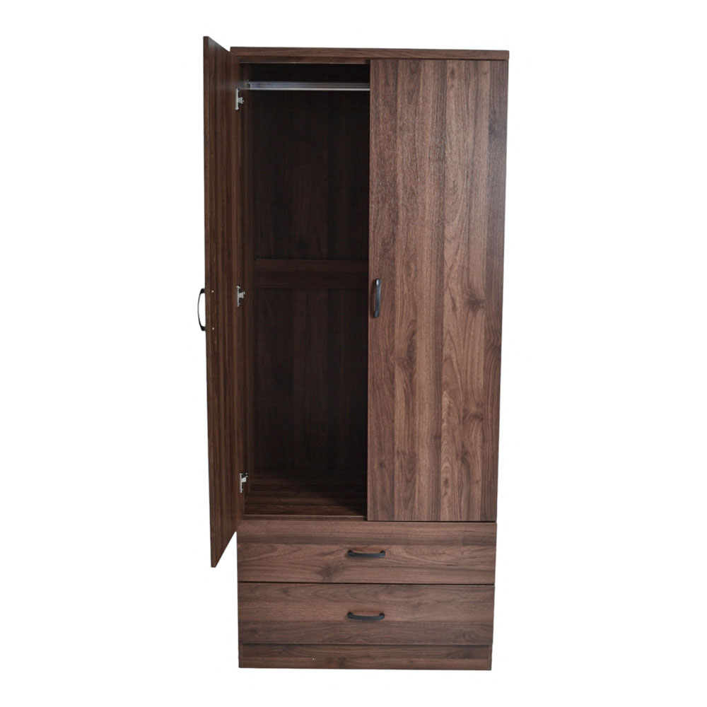 Ντουλάπα ξύλινη σε καρυδί χρώμα, με δύο φύλλα, μεταλλική ράγα για κρεμαστά ρούχα και δύο συρτάρια. Εξαιρετικής κατασκευής με μοντέρνο σχεδιασμό. Στην συσκευασία περιλαμβάνονται οδηγίες συναρμολόγησης.