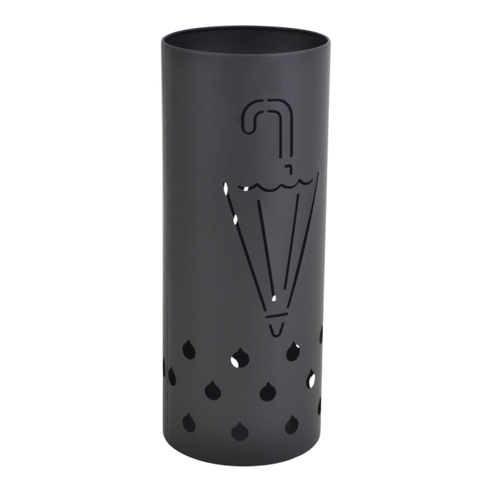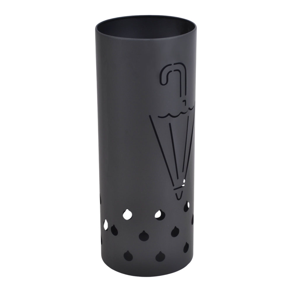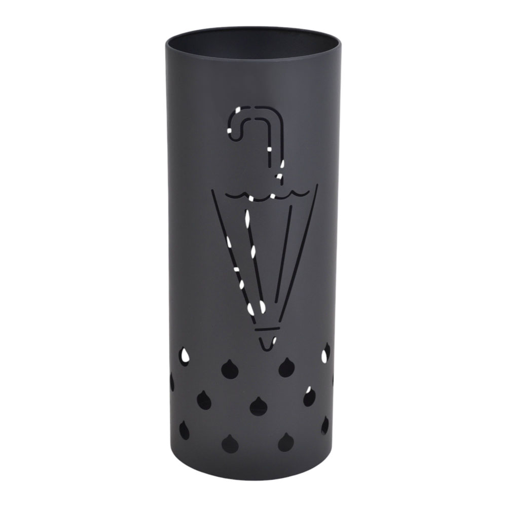 Ομπρελοθήκη μεταλλική στρογγυλή, σε μαύρο ματ χρώμα, με κομψή διάτρητη διακόσμηση ομπρέλας και σταγόνες βροχής. Διαθέτει μεταλλικό πάτο για σταθερότητα και αντοχή στην υγρασία, ενώ ο μοντέρνος σχεδιασμός της προσθέτει διακριτική αισθητική στην είσοδο του σπιτιού.