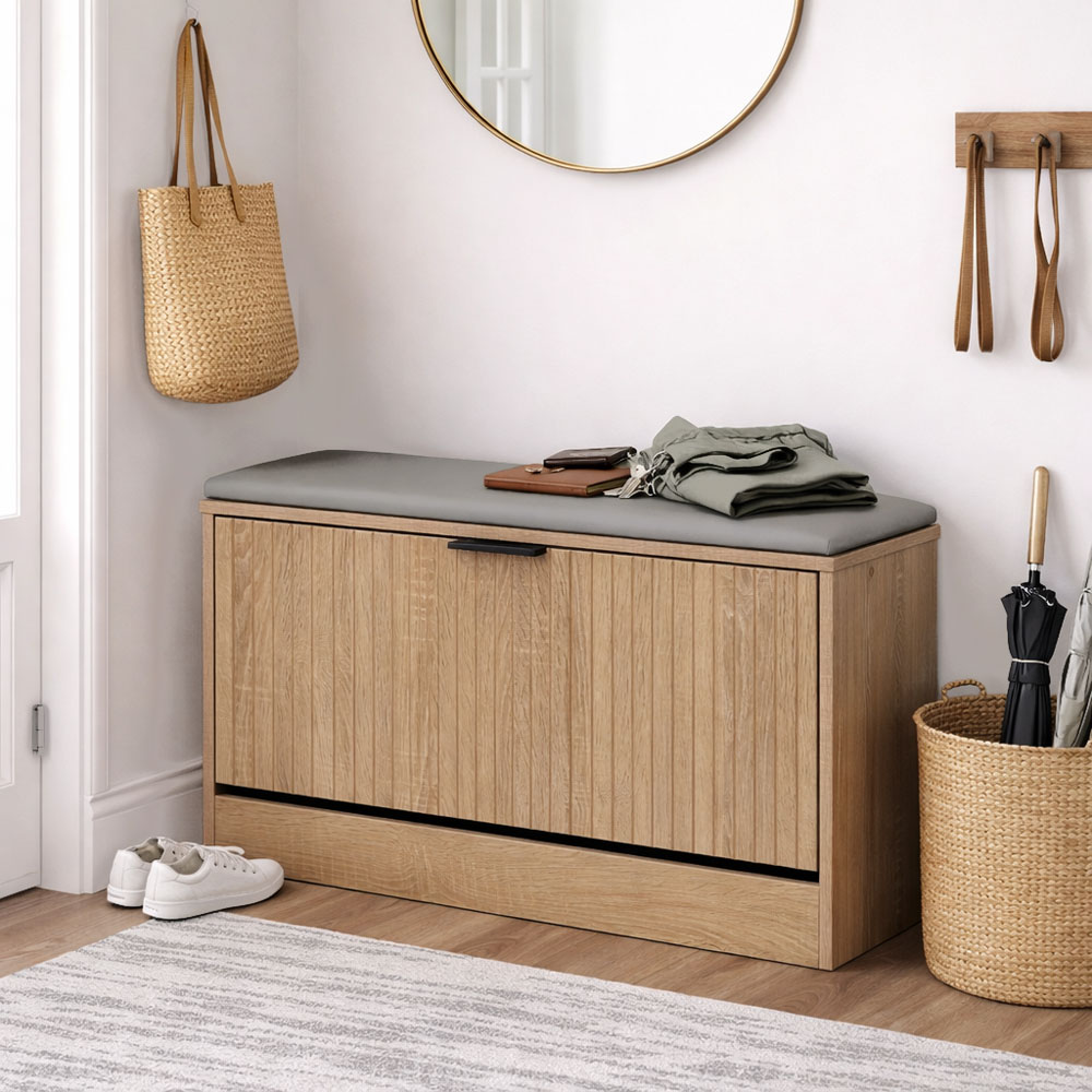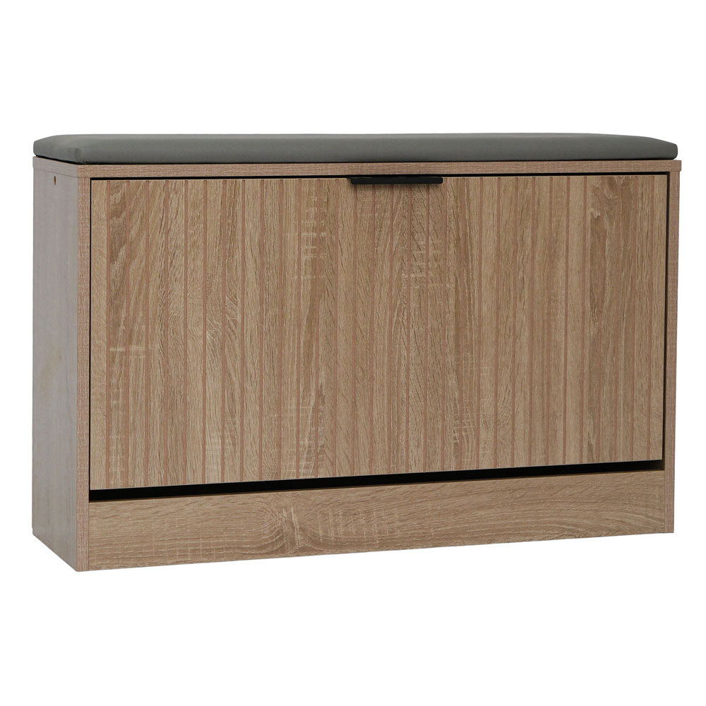 Παπουτσοθήκη από MDF με επένδυση μελαμίνης σε φυσική απόχρωση ξύλου, με ενσωματωμένο κάθισμα για μεγαλύτερη άνεση. Διαθέτει ανακλινόμενη πόρτα με εσωτερικό ράφι για οργανωμένη αποθήκευση υποδημάτων, ενώ το γκρι μαξιλάρι διευκολύνει την καθημερινή χρήση κατά την αλλαγή παπουτσιών. Η όψη φυσικού ξύλου με κάθετες ανάγλυφες γραμμές προσδίδει μοντέρνο και διαχρονικό χαρακτήρα. Ανθεκτική, πρακτική και εύκολη στο καθάρισμα, ιδανική για είσοδο ή χωλ.