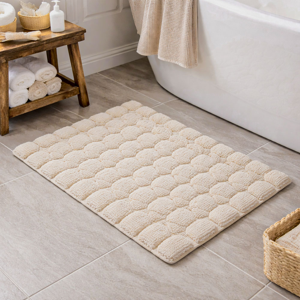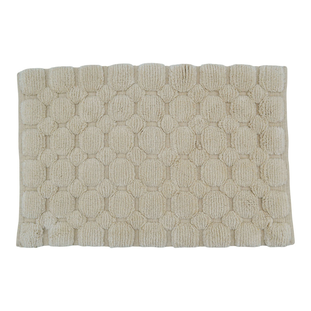 Χειροποίητο υφαντό πατάκι με ανάγλυφο γεωμετρικό μοτίβο κυψελωτής μορφής, σχεδιασμένο για άνεση και ασφάλεια στον χώρο του μπάνιου. Κατασκευασμένο από 100% βαμβάκι υψηλής ποιότητας με πυκνότητα 1800 gsm, προσφέρει εξαιρετική απορροφητικότητα και απαλή αίσθηση στο πάτημα. Η αντιολισθητική επίστρωση hotmelt στην κάτω πλευρά εξασφαλίζει σταθερότητα και μειώνει τον κίνδυνο ολίσθησης. Κατάλληλο για πλύσιμο, διατηρεί τη μορφή και την ποιότητά του με την πάροδο του χρόνου.