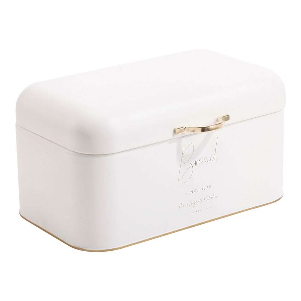 Μεταλλική ψωμιέρα σε λευκό ματ χρώμα με κομψές χρυσές λεπτομέρειες, ιδανική για την αποθήκευση και διατήρηση του ψωμιού. Διαθέτει πρακτικό καπάκι με λαβή για εύκολο άνοιγμα, προστατεύει το περιεχόμενο και προσθέτει αισθητική στον πάγκο της κουζίνας, ταιριάζοντας σε μοντέρνους και κλασικούς χώρους.