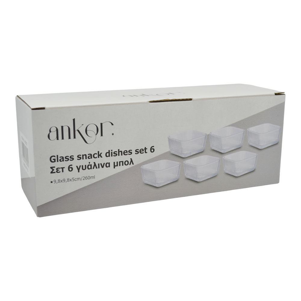 Σετ 6 γυάλινα μπολ με τετράγωνο σχήμα και ανάγλυφη υφή, ιδανικά για σερβίρισμα επιδορπίων, ξηρών καρπών, σνακ ή συνοδευτικών. Κατασκευασμένα από ανθεκτικό γυαλί, συνδυάζουν πρακτικότητα και κομψή εμφάνιση για κάθε καθημερινό ή επίσημο τραπέζι.