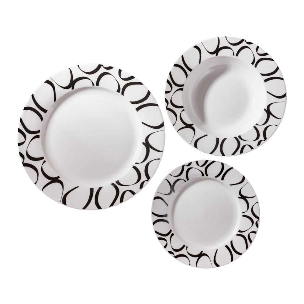 Σερβίτσιο φαγητού από ποιοτική πορσελάνη, στρογγυλό, με διακόσμηση στο πλαίσιο .Το σετ περιλαμβάνει 6 πιάτα ρηχά 26εκ.,6 πιάτα βαθιά 21,5εκ. και 6 πιάτα φρούτου 19εκ.Κατάλληλο για χρήση στο πλυντήριο πιάτων κ τον φούρνο μικροκυμάτων.