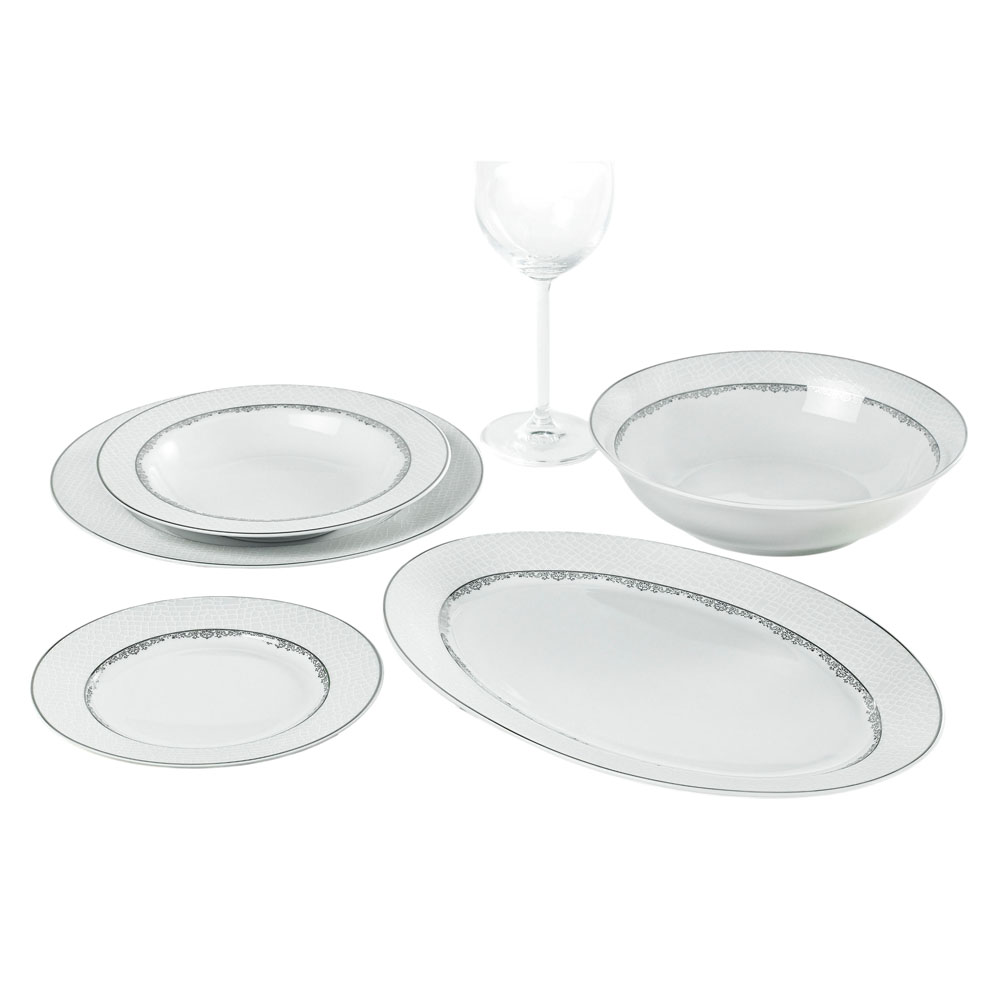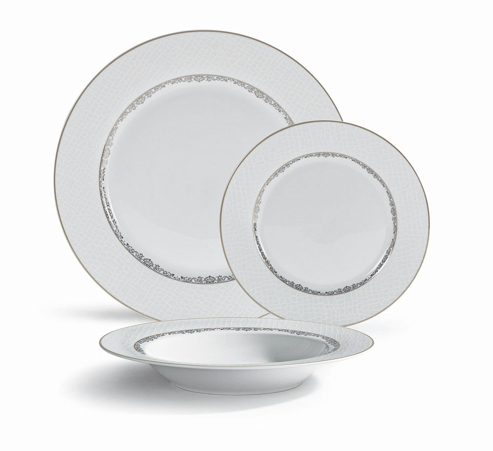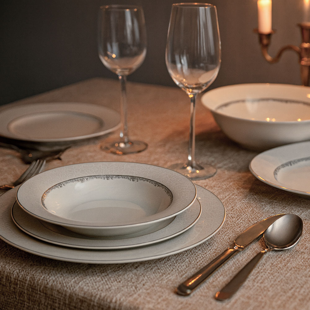 Σερβίτσιο φαγητού πορσελάνης, με ανάγλυφο κρακελέ σχέδιο και κομψή ασημί μπορντούρα που προσδίδει πολυτέλεια και φινέτσα στο τραπέζι.