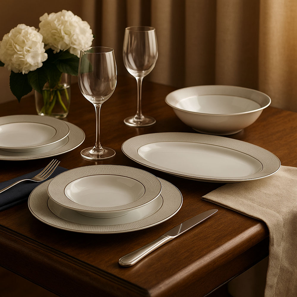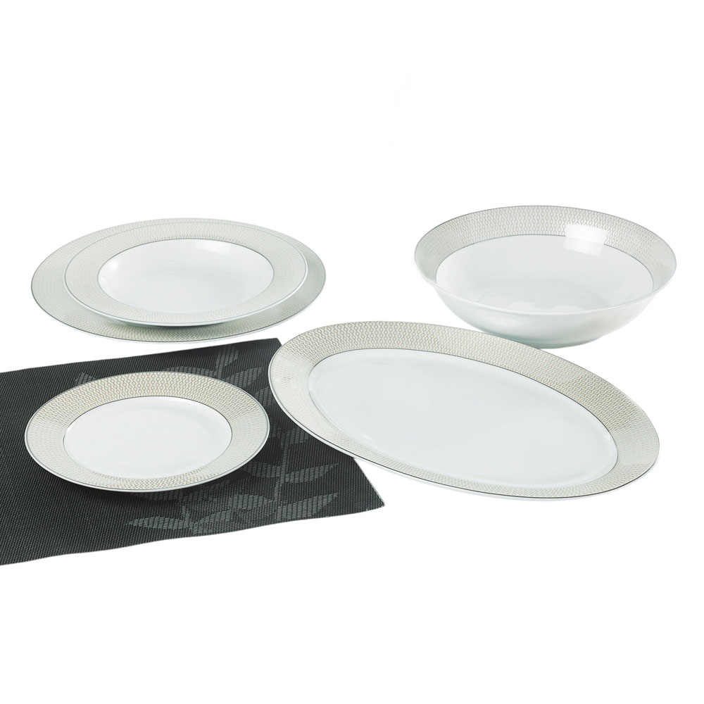 Σερβίτσιο φαγητού πορσελάνης, με διακριτικό χρυσό γεωμετρικό σχέδιο και ασημί μπορντούρα στο πλαίσιο που χαρίζει κομψότητα και πολυτέλεια.