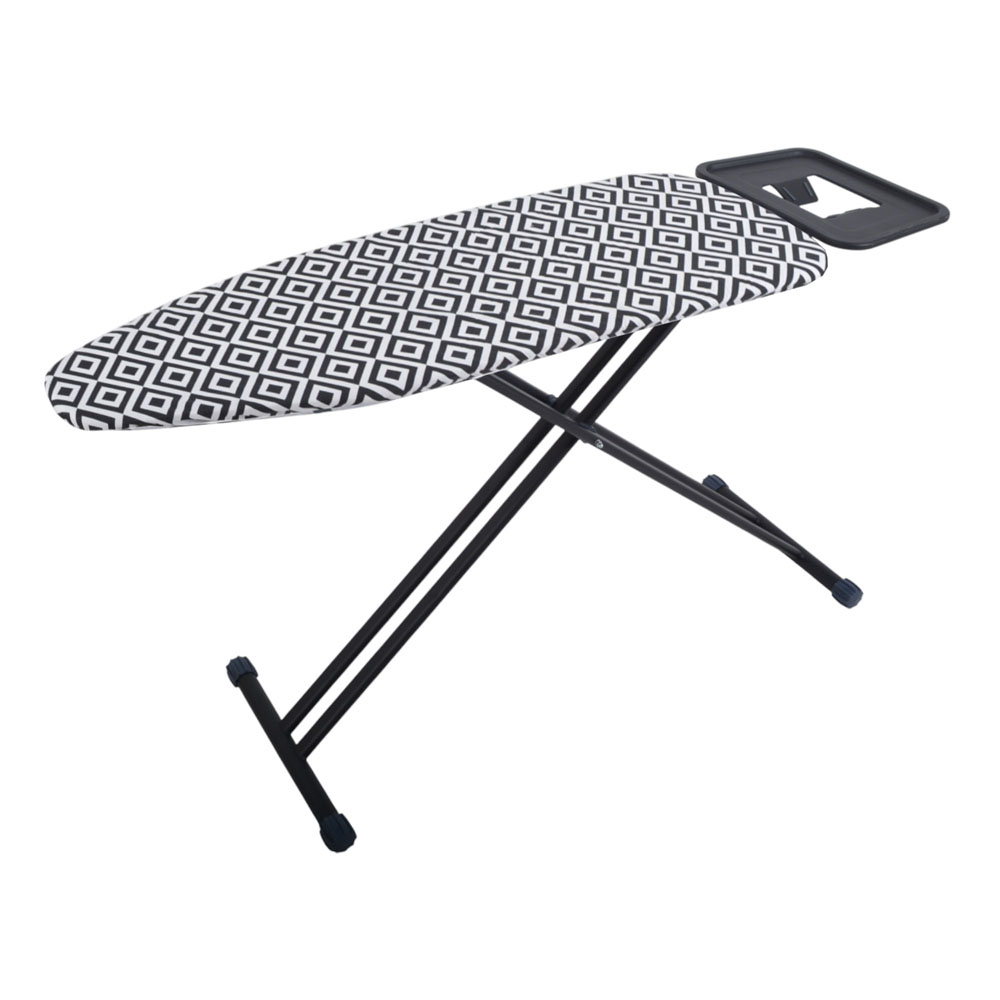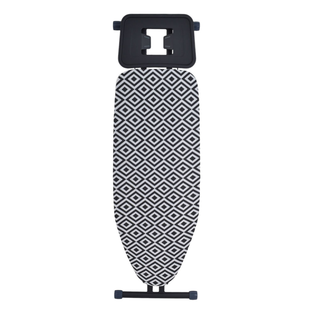 Σιδερώστρα με μεταλλικά μαύρα ματ πόδια, μεγάλη επιφάνεια σιδερώματος, ρύθμιση και ασφάλεια ύψους από 71 έως 94εκ.,θέση τοποθέτησης για το σίδερο και αντιολισθητικά ποδαράκια για μεγάλη ευστάθεια και σταθερότητα. Διαθέτει κάλυμμα 100% βαμβακερό.
