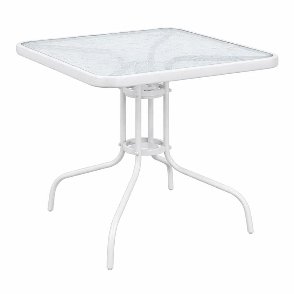 Τραπέζι τετράγωνο εξωτερικού χώρου με λευκό ματ μεταλλικό σκελετό, σχεδιασμένο για αντοχή και σταθερότητα. Η επιφάνειά του είναι από γυαλί tempered 5mm με σχέδιο water wave, που προσφέρει ιδιαίτερη αισθητική και αυξημένη ανθεκτικότητα. Τα πόδια κατασκευάζονται από σωλήνα διαμέτρου 24Φx0,9mm, εξασφαλίζοντας στιβαρή κατασκευή και ασφαλή στήριξη. Ιδανικό για χρήση σε μπαλκόνι, κήπο ή βεράντα.