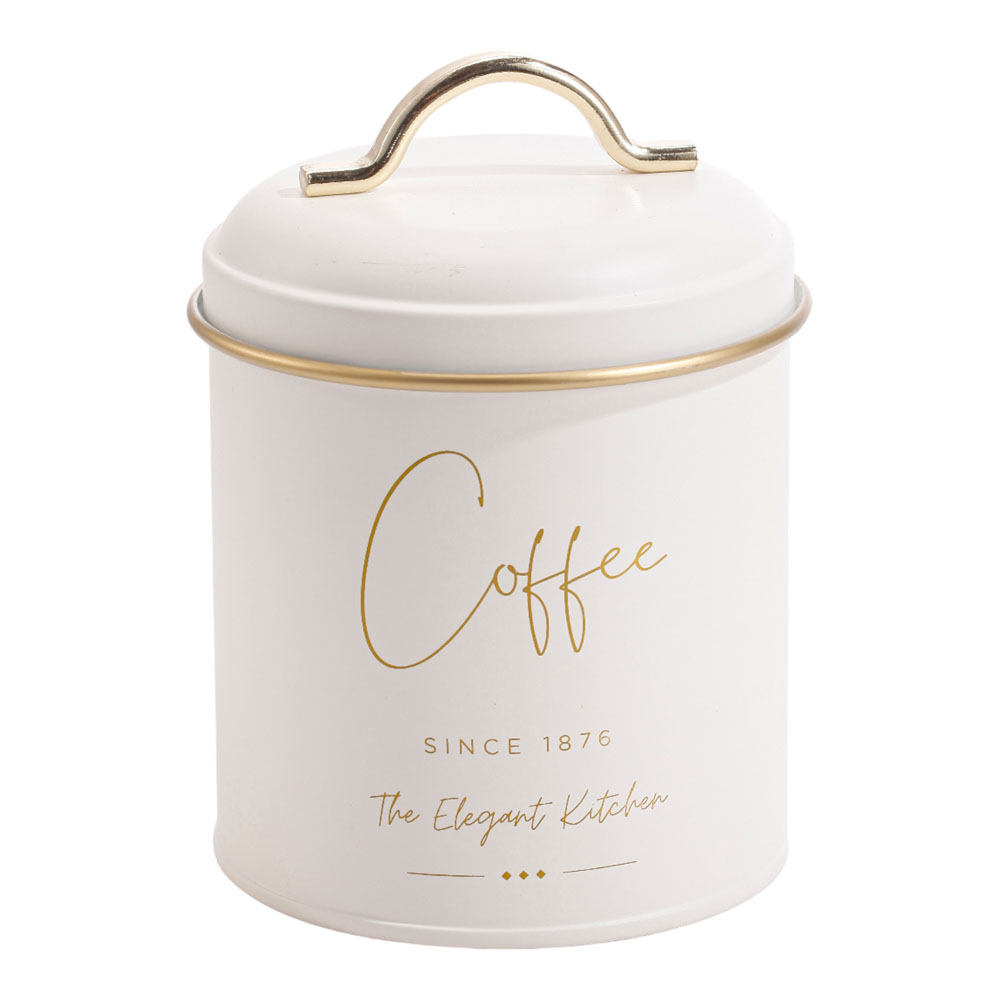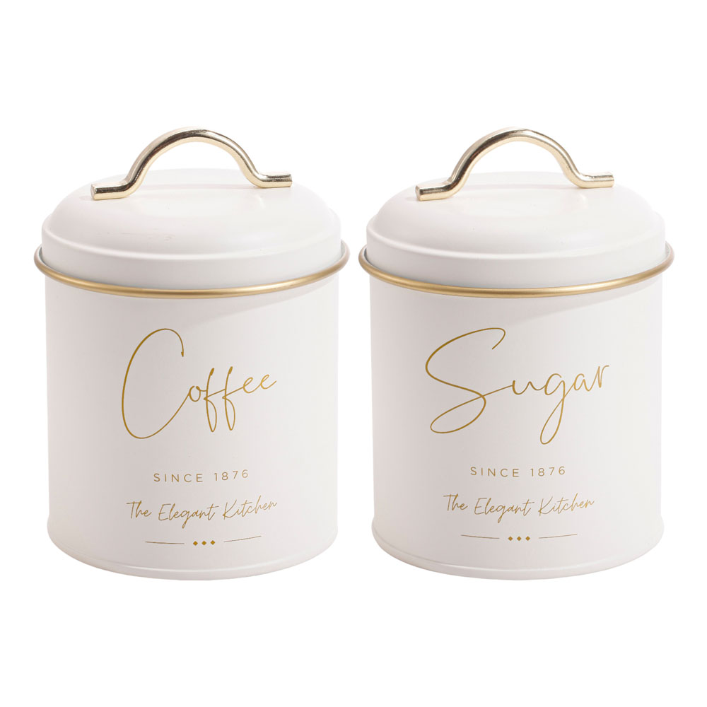 Σετ 2 μεταλλικά βάζα Coffee & Sugar σε λευκό ματ χρώμα με χρυσές λεπτομέρειες. Διαθέτουν μεταλλικό καπάκι και λαβή για εύκολο άνοιγμα και εσωτερική σιλικόνη για αεροστεγές κλείσιμο, προστατεύοντας το περιεχόμενο από την υγρασία.