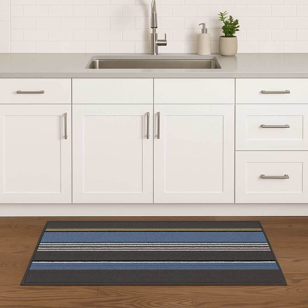 Διάδρομος με αντιολισθητική βάση TPR, σε αποχρώσεις του γκρι και του μπλε, με σχέδιο οριζόντιες ρίγες. Ιδανικός για χρήση μπροστά από τον νεροχύτη ή τον πάγκο εργασίας, προσφέρει άνεση στο περπάτημα κ προστασία από ολισθήσεις.