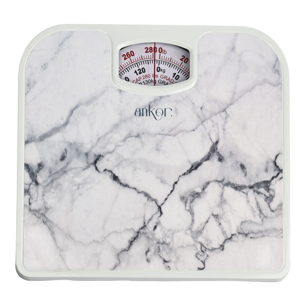 Ζυγαριά μπάνιου μηχανική με μέγιστο βάρος μέτρησης 130kg και διακόσμηση εφέ άσπρο μάρμαρο.