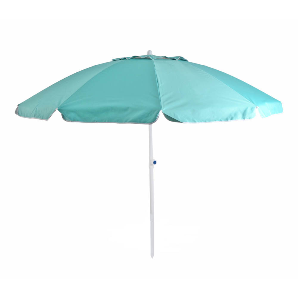 Ομπρέλα θαλάσσης μεταλλική διαμέτρου 2,25m, με 10 ακτίνες fiberglass διαμέτρου 6mm, πολυεστερικό ύφασμα 140gr/gsm σε τιρκουάζ χρώμα και πολυεστερικό ασημί ύφασμα εσωτερικά, προστασία UV60+ και αεραγωγό για εξαέρωση. Διαθέτει ανάκληση κ τσάντα μεταφοράς.